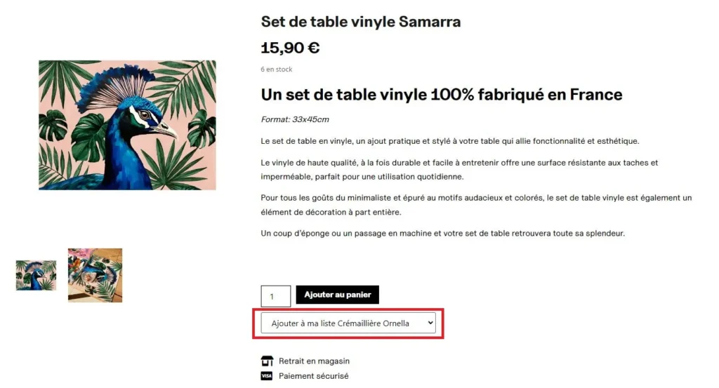 Une fois sur la fiche produit de l’article que vous souhaitez ajouter, vous retrouverez un bouton d’ajout direct à votre liste.