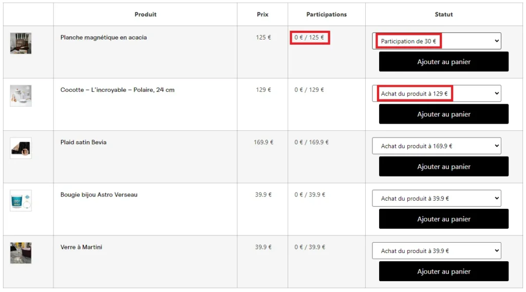 Sélectionnez les articles pour lesquels vous souhaitez participer et définissez le montant de votre participation.